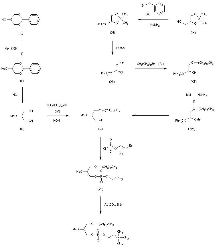Two different routes have been described for the preparation of Et-18-OCH3: 1) The methylation of 1,3-benzylideneglycerol (I) with methyl iodide and KOH gives 1,3-benzytidene-2-O-methylglycerol (II), which is hydrolyzed with HCl to 2-O-methylglycerol (III). The condensation of (III) with octadecyl bromide (IV) and KOH in DMSO/THF yields 1-O-octadecyl-2-O-methyl-(rac)-glycerol (V), which by reaction with phosphorodichloric acid 2-bromoethyl ester (VI) and pyridine is converted to 3-octadecyloxy-2-methoxypropyl bromoethyl phosphate (VII). Finally, this compound is converted to Et-18-OCH3 with trimethylamine (VIII) in toluene and treated with silver carbonate to remove traces of bromide. 2) The reaction of 1,2-isopropylidene-sn-glycerol (IX) with benzyl bromide (X) and NaNH2 in benzene gives 1,2-isopropylidene-3-O-benzyl-sn-glycerol (XI), which is hydrolyzed with acetic acid to 3-O-benzyl-sn-glycerol (XII). The etherification of (XII) with (IV) as before or with NaNH2 gives 1-O-octadecyl-3-O-benzyl-sn-glycerol (XIII), which is methylated with methyl iodide and NaNH2 in dioxane to give 1-O-octadecyl-2-O-methyl-3-O-benzyl-sn-glycerol (XIV). Finally, this compound is debenzytaled by hydrogenolysis with H2 over Pd/C in petroleum ether to form (V), an intermediate previously described above.