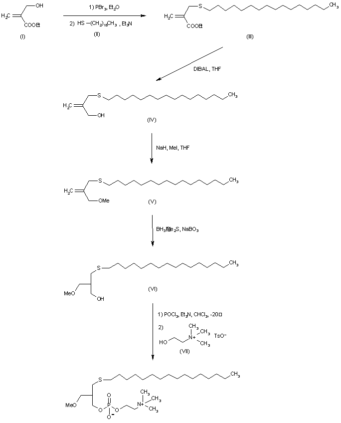 The reaction of 2-(hydroxymethyl)propenoic acid ethyl ester (I) with PBr3 and then with hexadecyl mercaptane (II) and TEA gives 2-(hexadecylsulfanylmethyl)propenoic acid methyl ester (III), which is reduced with DIBAL in THF to the corresponding carbinol (IV). The methylation of (IV) with methyl iodide and NaH in THF affords the methyl ether (V), which is hydroxylated at the double bond with BH3/Me2S and NaBO3 providing 3-(hexadecylsulfanyl)-2-(methoxymethyl)-1-propanol (VI). Finally this compound is treated with POCl3 and TEA in chloroform and condensed with choline tosylate (VII) to furnish the target phosphorylcholine derivative.