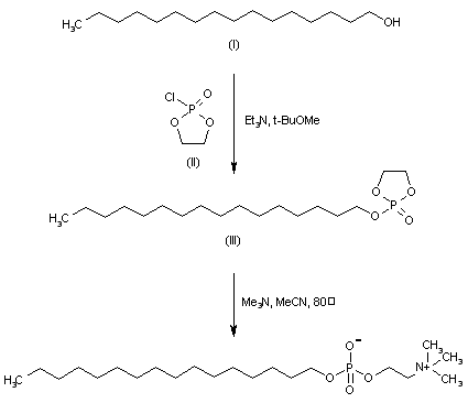 The reaction of hexadecanol (I) with the cyclic chlorophosphate ester (II) and TEA in tert-butyl methyl ether gives the cyclic hexadecyl phosphate (III), which is condensed with TEA in hot acetonitrile to afford the target phosphorylcholine ester.