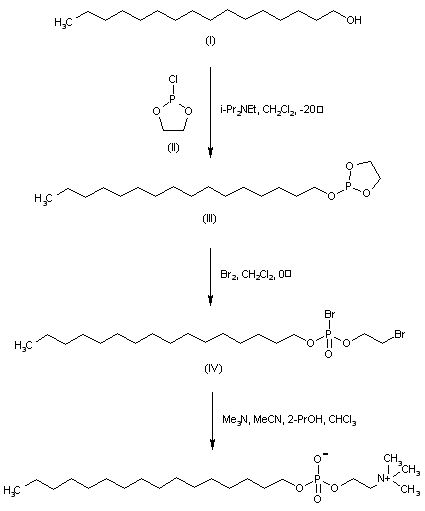 The reaction of hexadecanol (I) with the cyclic chlorophosphate ester (II) and DIEA in dichloromethane gives the cyclic hexadecyl phosphate (III), which is brominated with Br2 in the same solvent to yield the mixed 2-bromoethyl hexadecyl bromophosphate ester (IV). Finally this compound is condensed with trimethylamine in acetonitrile/isopropanol/chloroform to furnish the target phosphorylcholine ester.