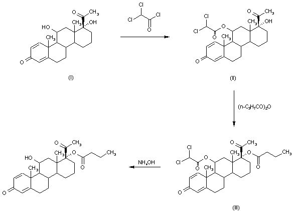 The partial acylation of 11beta,17a alpha(dihydroxy-D-homopregna-1,4-diene 3,20-dione (I) with 2,2-dichloroacetyl chloride gives the corresponding compound (II), which is acylated again with butyric anhydride yielding 17a alpha-butyryloxy-11beta-dichloroacetoxy-D-homopregna-1,4-diene-3,20-dione (III). Finally, this compound is hydrolyzed partially with aqueous NH4OH and methanol.
