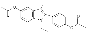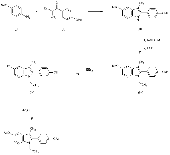 4-Methoxyaniline (I) is reacted with 2'-bromo-4-methoxypropiophenone (II) to afford the indole (III). The ethyl group is introduced by deprotonation with sodium hydride in DMF followed by addition of ethyl bromide. The ether cleavage of (IV) with BBr3 yields the hydroxy derivative (V), which is converted to the acetate by using acetic acid an hydride in pyridine.