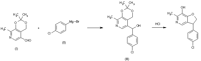 The Grignard reaction of 2,2,8-trimethyl-5-formylpyrido[4,3-e]-1,3-dioxane (I) with 4-chlorophenyl magnesium bromide (II) in refluxing ether gives 2,2,8-trimethyl-5-(4-chloro-alpha-hydroxybenzyl)pyrido[4,3-e]-1,3-dioxane (III), which is then hydrolyzed and cyclized by a treatment with aqueous concentrated HCl