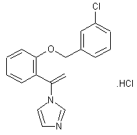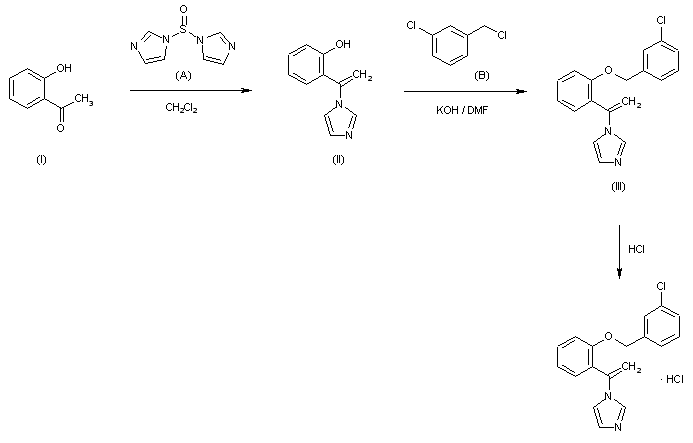 This 1-vinyl derivative (II) is obtained by reaction of N,N'-thionyldiimidazole (A) with o-hydroxyacetophenone (I) in dichloromethane at room temperature. Treatment of (II) with m-chlorobenzyl chloride (B) in the presence of KOH in DMF gives the m-chlorobenzyl ether (III). The hydrochloride can be prepared by treatment of (III) with HCl in AcOEt.