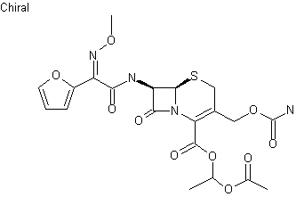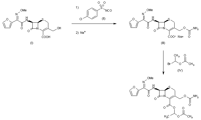 The reaction of 3-hydroxymethyl-7-[2-(2-furyl)-2-methoxyiminoacetamido]-3-cephem-4-carboxylic acid (I) with chlorosulfonyl isocyanate (II) and then with sodium 2-ethylhexanoate gives sodium cefuroxime (III), which is then treated with 1-bromoethyl acetate (IV) in DMA.