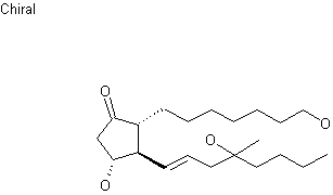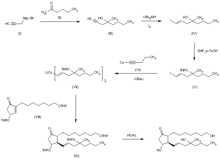 The Grignard reaction of propargylmagnesium bromide (I) with 2-hexanone (II) in ether gives 4-methyloct-1-in-4-ol (III), which by reaction with diisobutylaluminum hydride and I2 is converted to 1-iodo-4-methyloct-1-en-4-ol (IV). The reaction of (IV) with dihydropyran and p-toluenesulfonic acid yields the corresponding tetrahydropyranyloxy derivative (V), which by reaction with tert-butyllithium and copper pentyne (VI) affords the corresponding organolithiocuprate (VII). The condensation of (VII) with 4R-(tetrahydropyranyloxy)-2-[7-(tetrahydropyranyloxyl)heptyl]cyclopent-2-en-1-one (VIII) in ether gives 1,11,16-tris(tetrahydropyranyloxy)-16-methylprost-13-en-9-one (IX), which is finally deprotected by a treatment with acetic acid in water THF.
