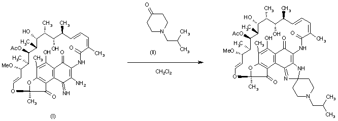 By reaction of 3-amino-4-deoxo-4-iminorifamycin S (I) with N-(2-methylpropyl)-4-piperidone (II) in methylene chloride.
