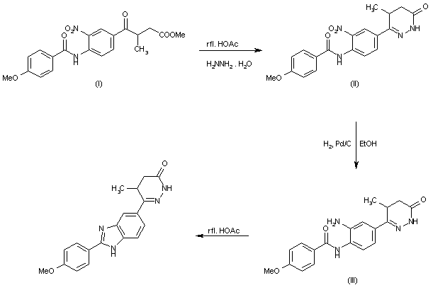 The cyclization of methyl 3-[4-(4-methoxybenzoylamino)-3-nitrobenzoyl]butyrate (I) with hydrazine hydrate in refluxing acetic acid gives 4,5-dihydro-6-[4-(4-methoxybenzoylamino)-3-nitrobenzoyl]-5-methylpyridazin-3(2H)-one (II), which is reduced with H2 over Pd/C in ethanol yielding the corresponding amino derivative (III). Finally, this compound is cyclized in refluxing acetic acid.