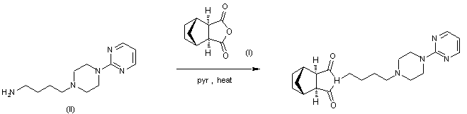 By condensation of norbornane-2,3-di-endo-carboxylic anhydride (I) with 1-(4-aminobutyl)-4-(2 pyrimidinyl)piperazine (II) in refluxing pyridine.