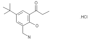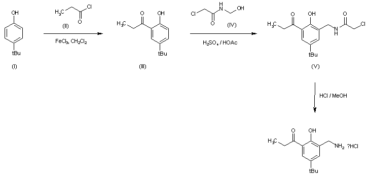 | 合成路线图解说明: The Friedel-Kraft's condensation of 4-tert-butylphenol (I) with propionyl chloride (II) by means of FeCl3 in methylene chloride gives 2-hydroxy-5-tert-butylpropiophenone (III), which is then condensed with chloroacetylaminomethanol (IV) by means of H2SO4 in acetic acid affording 3-(chloroacetylaminomethyl)-5-tert-butyl-2-hydroxypropiophenone (V). Finally, this compound is hydrolyzed with HCl in methanol. |
