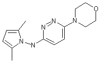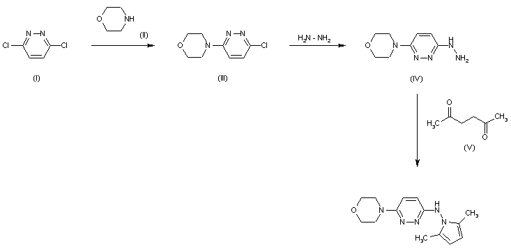 The starting compound is 3,6-dichloropyridazine (I), which is reacted with morpholine (II) in a suitable solvent to give 3-morpholino-6-chloropyridazine (III). This, upon reaction with hydrazine hydrate as solvent, gives the hydrazine derivative (IV), which by reaction with acetonylacetone (V) in acetic acid yields directly the title compound. [14C]-Labeled compound is synthesized by a microscale procedure with 45% chemical yield and 98% radiochemical purity.