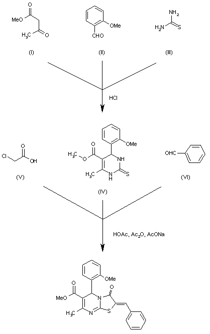 The cyclization of methyl acetoacetate (I), 2-methoxybenzaldehyde (II) and thiourea (III) by means of HCl in refluxing ethanol gives the tetrahydropyrimidine (IV), which is finally cyclized with chloroacetic acid (V) and benzaldehyde (VI) by means of sodium acetate in a refluxing mixture of acetic acid and acetic anhydride.