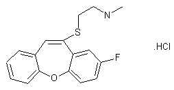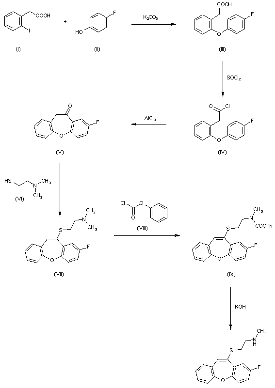 The condensation of 2-iodophenylacetic (I) with 4-fluorophenol (II) by means of K2CO3 in nitrobenzene al 160 C gives 2-(4-fluoophenoxy)phenylacetic acid (III), which by treatment with refluxing SOCl2 is converted to the corresponding acid chloride (IV). The cyclization of (IV) by means of AlCl3 in refluxing dichloroethane affords 2-fluoro-10,11-dihydro-11-oxodibenzo[b,f]oxepin (V), which is treated with 2-(dimethylamino)ethylthiol (VI) and boron trifluoride ethereate in acetic acid yielding 2-fluoro-11-[2-(dimethylamino)ethythio]dibenzo[b,f]oxepin (VII). The reaction of (VII) with phenyl chloro-formate (VIII) by means of K2CO3 in methylene chloride affords 2-fluoro-11-[2-(N-methyl-N-phenyloxycarbonylamino)ethythio]dibenzo[b,f]oxepin (IX), which is finally hydrolyzed with KOH-ethylene glycol al 155 C.