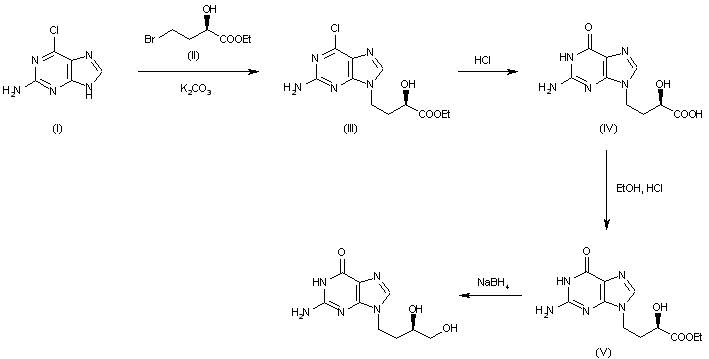 The condensation of 2-amino-6-chloropurine (I) with ethyl 4-bromo-2-hydroxybutyrate (II) by means of K2CO3 in DMF gives ethyl 4-(2-amino-6-chloropurin-9-yl)-2-hydroxybutyrate (III), which 8-hydrolyzed with refluxing aqueous HCl yielding 4-(9-guanyl)-2-hydroxybutyric acid (IV). The esterification of (IV) with ethanol - HCl affords the corresponding ethyl ester (V), which is finally reduced with NaBH4 in refluxing isopropanol.