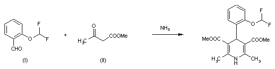 By cyclization of 2-(difluoromethoxy)benzaldehyde (I) with methyl acetoacetate (II) and refluxing aqueous concentrated ammonia.