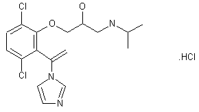 This 1-vinylimidazole compound (II) is obtained by reaction of N,N'-thionyldiimidazole (A) with 2-hydroxy-3,6-dichloroacetophenone (I) in dichloro-methane. Treatment of (II) with epibromohydrin (B) in DMF in the presence of NaH gives the epoxy compound (III), which is then treated with isopropylamine (C) to obtain the propanolamine compound (IV). The hydrochloride can be prepared by treatment of the free base (IV) with one molar equivalent of HCl in AcOEt.