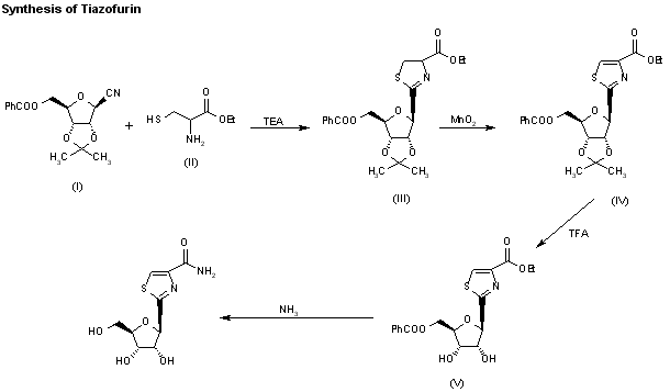 The reaction of 1-O-acetyl-2,3,5-tri-O-benzoyl-beta-D-ribofuranose (I) with Tms-CN and SnCl4 in dichloromethane gives the carbonitrile (II), which is cyclized with L-cysteine methyl ester (III) by means of TEA in dichloromethane to yield the thiazoline carboxylate (IV). The dehydrogenation of (IV) by means of BrCCl3 and DBU in the same solvent affords the thiazole carboxylate (V), which is finally treated with ammonia in methanol to hydrolyze the benzoate groups and form the carboxamide residue of the target tiazofurin.