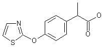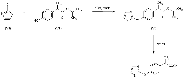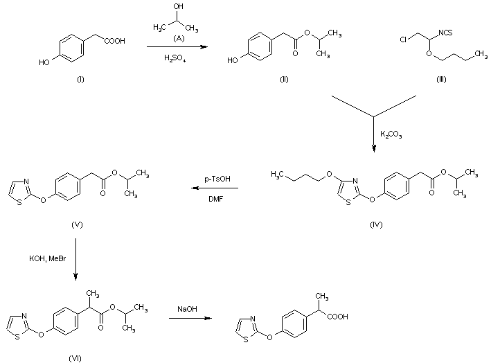 The esterification of 4-hydroxyphenylacetic acid (I) with isopropanol and H2SO4 gives the corresponding isopropyl ester (II), which is then cyclocondensed with 1-isobutoxy-2-chloroethyl isothiocyanate (III) by means of K2CO3 in acetone yielding isopropyl 2-[4-(4-isobutoxy-2-thiazolin-2-yloxy) phenyl]acetate (IV). Elimination of isobutanol from (IV) by means of p-toluenesulfonic acid in hot DMF affords isopropyl 2-[4-(2-thiazolyloxy)phenyl] acetate (V), which is methylated with methyl bromide and KOH in DMF giving isopropyl 2-[4-(2-thiazo)yloxy)phenyl]propionate (VI). Finally, this compound is hydrolyzed with NaOH in aqueous methanol.