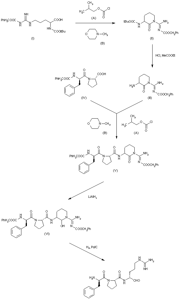 N2-tert-Butyloxycarbonyl-N5-benzyloxycarbonyl-L-arginine (I) is cyclized by treatment with isobutyloxycarbonyl chloride and N-methylmorpholine to the lactam (II). The tert-butyloxycarbonyl group is removed by hydrochloric acid to give the aminolactam (III), which is coupled with N-benzyloxycarbonyl-D-phenylalanyl-L-proline (IV) using, as in the first step, the mixed anhydride method. The resulting tripeptide lactam (V) is reduced with LiAlH4 to an aldehyde, present as the cyclic alpha-aminoalcohol (VI). Deblocking by hydrogenolysis gives RGH-2958. In solution the aldehyde group is either in the cyclic alpha-aminoalcohol form or is hydrated.