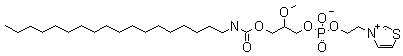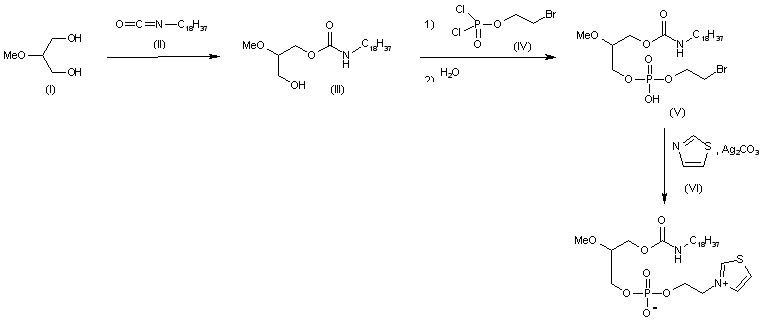 The condensation of 2-methoxypropane-1,3-diol (I) with octadecylisocyanate (II) in pyridine gives 3-(N-octadecylcarbamoyloxy)-2-methylpropanol (III), which is esterified with 2-bromoethyl phosphorodichloridate (IV) by means of pyridine in benzene and treated with water to afford 3-(N octadecyicarbamoyloxy)-2-methoxypropyl2-bromoethyl acid phosphate (V). Finally, this compound is treated with thiazole (VI) and Ag2CO3 in hot toluene.
