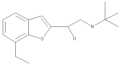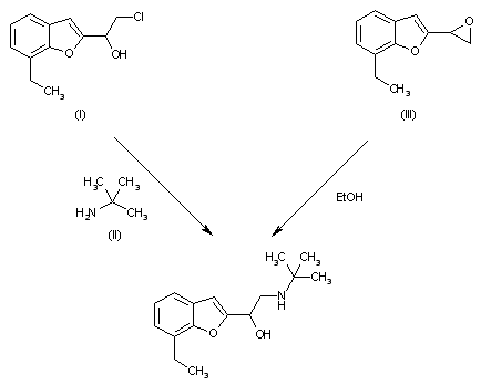 The condensation of tert-butylamine (II) with 2-(2-chloro-1-hydroxyethyl)-7-ethylbenzofuran (I) or with 2-epoxyehtyl-7-ethylbenzofuran (III) in refluxing ethanol.
