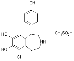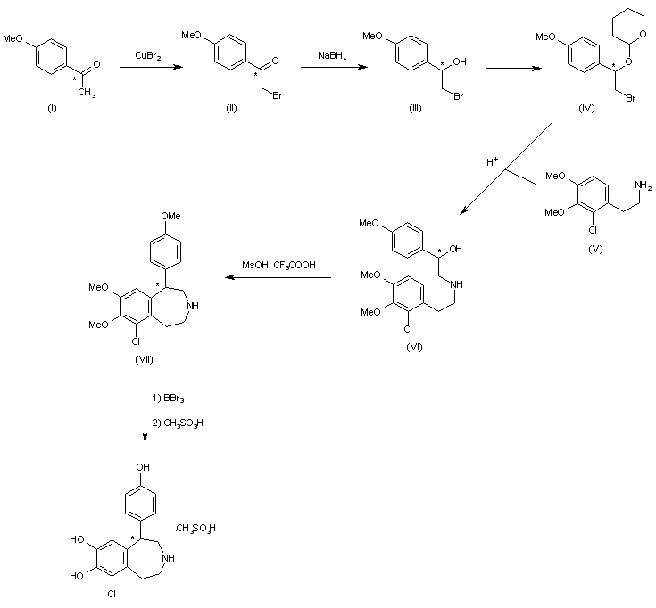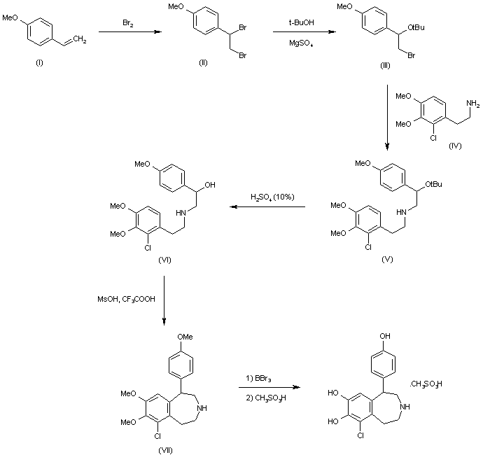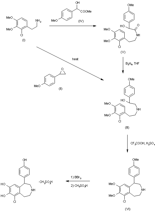 The condensation of 2-chloro-3,4-dimethoxyphenylethylamine (I) with 4-methoxystyrene oxide (II) in refluxing THF gives the hydroxy phenylethylamine (III). The yield of this reaction is only 19%. In a better sequence (I) is heated with methyl 4-methoxymandelate (IV) to give the mandelamide (V), which is then reduced without purification by B2H6 in THF to give (III). The latter is cyclized by treatment with trifluoroacetic acid - sulfuric acid yielding 6-chloro-7,8-dimethoxy-1-(4-methoxyphenyl)-2,3,4,5-tetrahydro-(1H)-3-benzazepine (VI). Finally, this compound is demethylated by treatment with BBr3 in methylene chloride and treated with methanesulfonic acid.