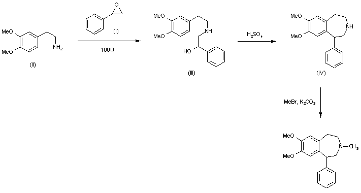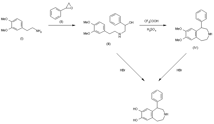 The condensation of 3,4-dimethoxyphenethylamine (I) with styrene oxide (II) by heating at 100 C gives N-[2-(3,4-dimethoxyphenyl)ethyl]-2-phenyl-2-hydroxyethylamine (III), which can be cyclized with H2SO4 in refluxing trifluoroacetic acid yielding 2,3,4,5-tetrahydro-7,8-dimethoxy-1-phenyl-1H-3-benzazepine (IV). Finally, intermediate (IV) is demethylated with refluxing 48% HBr (III) can also by cyclized and demethylated simultaneously by refluxing with 48% HBr.