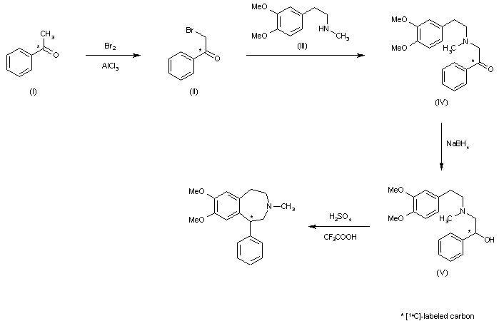 The bromination of labeled acetophenone (I) with Br2 and AlCl3 gives phenacyl bromide (II), which is condensed with N-[2-(3,4-dimethoxyphenyl)ethyl]-N-methylamine (III), yielding the 2-aminoacetophenone (IV). The reduction of (IV) with NaBH4 affords the secondary alcohol (V), which is finally cyclized by means of H2SO4 and trifluoroacetic acid to provide the target 3-benzazepine.