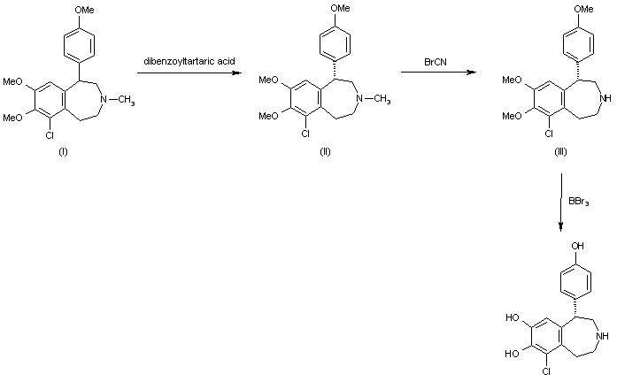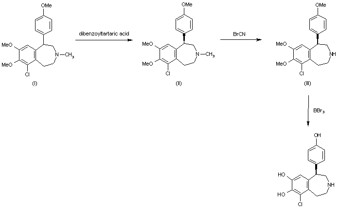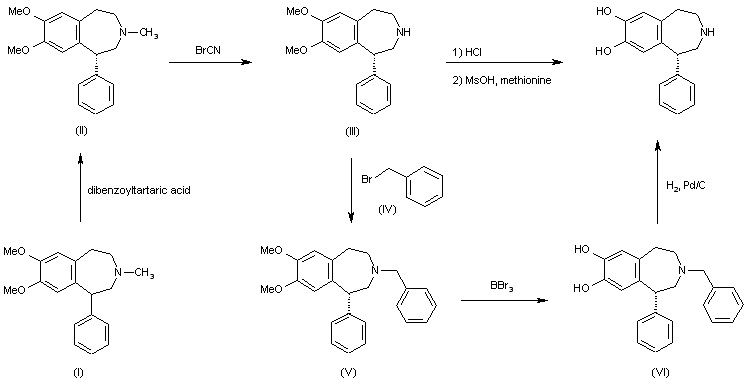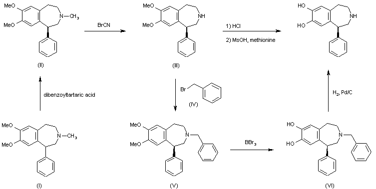 The optical resolution of the racemic 7,8-dimethoxy-3-methyl-1-phenyl-2,3,4,5-tetrahydro-1H-3-benzazepine (I) (+)- or (-)-dibenzoyltartaric acid gives the corresponding (S)-isomer (II), which is N-demethylated by means of CN-Br to yield 7,8-dimethoxy-1(S)-phenyl-2,3,4,5-tetrahydro-1H-3-benzazepine (III). Finally, this compound is fully demethylated by treatment with MsOH and methionine. An earlier alternative route to demethylation of (III) involves its conversion to the N-benzyl derivative (V) with benzyl bromide (IV), followed by demethylation with BBr3, yielding (VI), and final debenzylation with H2 over Pd/C.