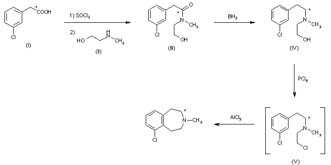 The condensation of labeled 2-(3-chlorphenyl)acetic acid (I) with N-methylethanolamine (II) by means of SOCl2 gives the corresponding amide (III), which is reduced with BH3, yielding the tertiary amine (IV). The reaction of (IV) with PCl3 affords the chloroethylamine (V), which is finally cyclized by means of AlCl3 to provide the target benzazepine.