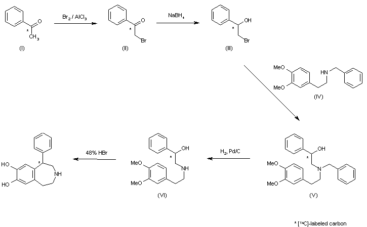 The bromination of labeled 4'-methoxyacetophenone (I) with CuBr2 gives 4'-methoxyphenacyl bromide (II), which is reduced with NaBH4, yielding the carbinol (III). The protection of (III) with DHP affords the tetrahydropyranyl ether (IV), which is condensed with 2-(2-chloro-3,4-dimethoxyphenyl)ethylamine (V) and acidified to provide the aminoalcohol (VI). The cyclization of (VI) with MsOH and trifluoroacetic acid furnishes labeled 6-chloro-7,8-dimethoxy-1-(4-methoxyphenyl)-2,3,4,5-tetrahydro-1H-3-benzazepine (VII), which is finally demethylated with BBr3 and MsOH.