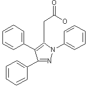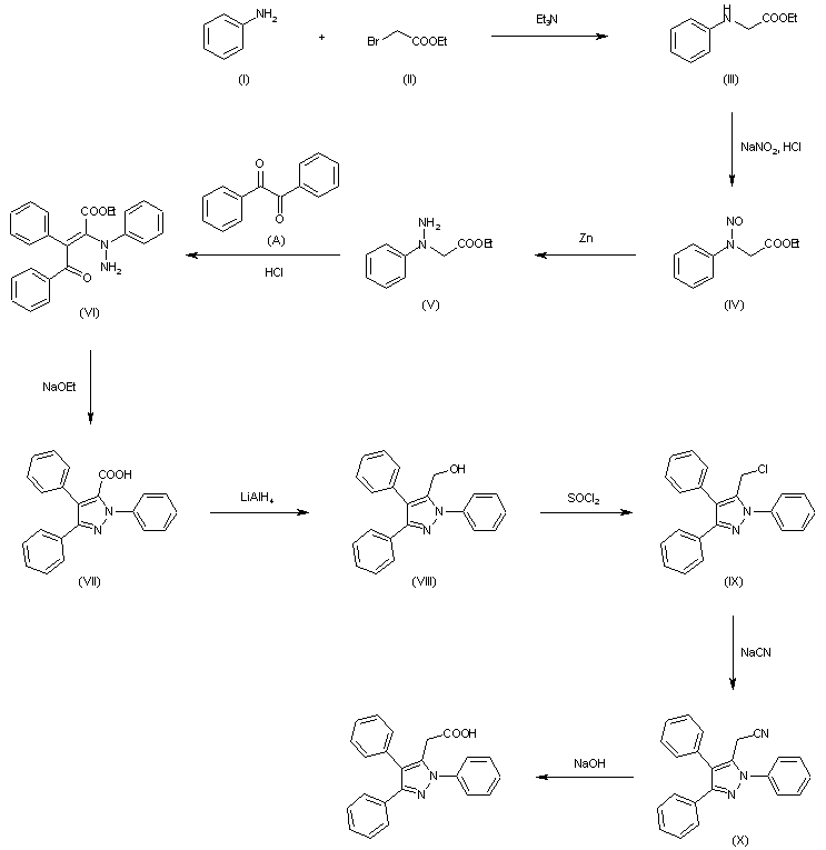 The reaction of aniline (I) with ethyl bromoacetate (II) by means of triethylamine in benzene gives ethyl phenylaminoacetate (III), which is nitrosated with NaNO2 and HCl in water to yield ethyl N-nitrosophenylaminoacetate (IV). The reduction of (IV) with Zn in ethanol-water-acetic anhydride affords ethyl N1-phenylhydrazinoacetate (V), which is condensed with benzil (A) by means of HCl-sodium acetate in refluxing ethanol-water to yield ethyl alpha-benzoylbenzylidene-N1-phenylhydrazinoacetate (VI). The cyclization of (VI) by means of sodium ethoxide in refluxing ethanol gives 1,3,4-triphenylpyrazole-5-carboxylic acid (VII), which is reduced with LiAlH4 in ether-THF to produce 1,3,4-triphenyl-5-(hydroxymethyl)pyrazole (VIII). The reaction of (VIII) with SOCl2 in refluxing chloroform yields 1,3,4-triphenyl-5-(chloromethyl)pyrazole (IX), which by reaction with NaCN in hot DMSO is converted into 1,3,4-triphenylpyrazole-5-acetonitrile (X). Finally, this compound is hydrolyzed by means of NaOH in refluxing aqueous ethanol.