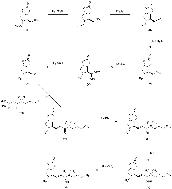 The resolution of racemic 3,3alpha-beta,4,5,6,6alpha-beta-hexahydro-4beta-nitromethyl-5alpha-carboxy-2H-cyclopenta[b]furan-2-one (I), with R(+)-alpha-methyl-p-nitrobenzylamine gives optical active 3,3aR,4,5,6,6aS-hexahydro-4R-nitromethyl-5R-carboxy-2H-cyclopenta[b]furan-2-one (I), which is reduced with borane-methyl sulfide complex in ethyl acetate yielding the corresponding hydroxymethyl compound (II). The reaction of (II) with I2 and triphenylphosphine in HMPT affords the iodomethyl derivative (III), which is finally reduced with sodium cyanoborohydride in the same solvent to give 3,3aR,4,5,6,6aS-hexahydro-4S-nitromethyl-5R-methyl-2H-cyclopenta[b]furan-2-one (IV). The treatment of (IV) with sodium methoxide in methanol and with H2SO4-methanol yields the 4S-dimethoxymethyl derivative (V), which is hydrolyzed with trifluoro acetic acid in water-CHCl3 to afford the corresponding 4S-formyl compound (VI). The Wittig reaction of (VI) with dimethyl (3,3-dimethyl-2-oxoheptyl)phosphonate (VII) in 1,2-dimethoxyethane affords 3,3aR,4,5,6,6aS-hexahydro-4R-(4,4-dimethyl-3-oxo-1-trans-octenyl)-5R-methyl-2H-cyclopenta[b]furan-2-one (VIII), which is reduced with NaBH4 in methanol to yield the corresponding 3S-hydroxy compound (IX). The protection of the hydroxy group of (IX) with dihydropyran/p-toluenesulfonic acid in CH2Cl2 affords the 3S-tetrahydropyranyloxy compound (X), which is reduced again with diisobutyl aluminum hydride in toluene to afford 3,3aR,4,5,6,6-hexahydro-4R-(4,4-dimethyl-3R-tetrahydropyranyloxy-1-trans-octenyl)-5R-methyl-2H-cyclopenta[b]furan-2-ol (XI).
