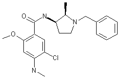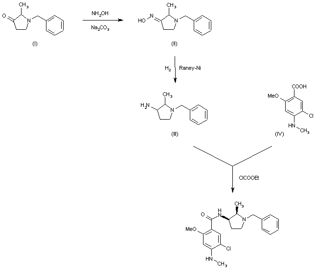 The reaction of 1-benzyl-2-methyl-3-pyrrolidone (I) with hydroxylamine by means of Na2CO3 in hot ethanol gives the corresponding oxime (II), which is reduced with H2 over Raney-Ni in methanol containing ammonia to afford 1-benzyl-2-methyl-3-aminopyrrotidine (III). Finally, this compound is condensed with 2-methoxy-4-methylamino-5-chlorobenzoic acid (IV) by means of ethyl chlorocarbonate and triethylamine in methylene chloride.