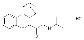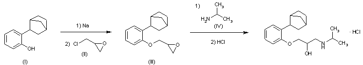 The condensation of sodium 2-(2-exo-norbornyl)phenoxide [from 2-bicyclo[2.2.1]hept-2-ylphenol (I) and sodium] with epichlorohydrin (II) gives (III), which is then treated with isopropylamine (IV) and finally with isopropanolic HCl.