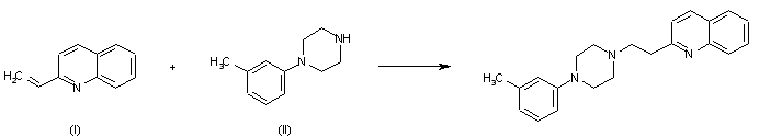 Centhaquin is synthesized by the reaction of 2-vinylquinoline (I) with 4-(3-methylphenyl)piperazine (II).