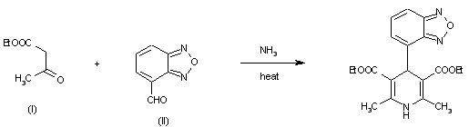By cyclization of ethyl acetoacetate (I), 2,1,3-benzoxadiazole-4-carboxaldehyde (II) and concentrated NH3 in refluxing ethanol.