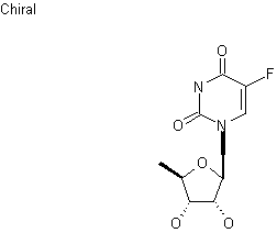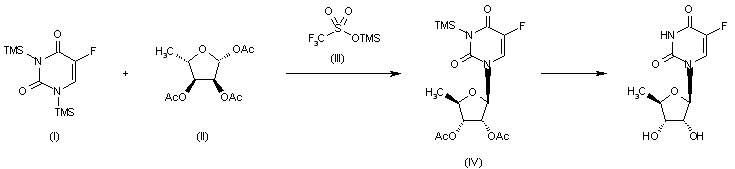 The condensation of bis(trimethylsilyl)fluorouracil (I) with 5-deoxy-1,2,3-tri-O-acetyl-D-ribofuranose (II) in the presence of trimethylsilyl trifluoromethanesulfonate (III) gives the fully protected compound (IV), which is finally deprotected by the usual methods.