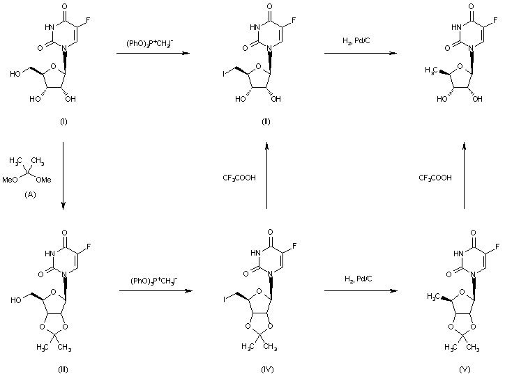 This compound can be prepared by several different ways: 1) The reaction of 5-fluorouridine (I) with 2,2-dimethoxypropane (A) by means of p-toluenesulfonic acid gives 2',3'-isopropylidene-5-fluorouridine (III), which is treated with triphenylphosphite methiodide in DMF to afford 5'-deoxy-5'-iodo-2',3'-isopropylidene-5-fluorouridine (IV). The reduction of (IV) with H2 over Pd/C in methanol-triethyl-amine yields 5'-deoxy-2',3'-isopropylidene-5-fluorouridine (V), which is finally hydrolyzed with aqueous trifluoroacetic acid. 2) The hydrolysis of compound (IV) with aqueous trifluoroacetic acid as before gives 5'-deoxy-5'-iodouridine (II), which is finally reduced with H2 over Pd/C as before. 3) Compound (II) can also be obtained by reaction of (I) with triphenyl phosphite methiodide as before. 4) It can also be prepared via reduction of the 5'-chloro intermediate with tributyltin hydride.