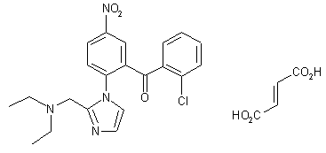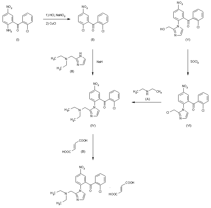 Compound can be prepared in two different ways: 1) The Sandmeyer reaction of 2-amino-5-nitro-2'-chlorobenzophenone (I) with HCl, NaNO2 and CuCl gives 2,2'-dichloro-5-nitrobenzophenone (II), which is condensed with 2-diethylaminomethylimidazole (III) by means of NaH in DMF to afford the free base of Y-9179 (IV). Finally, this compound is treated with fumaric acid (B). 2) The treatment of 1-[2-(2-chlorobenzoyl)-4-nitrophenyl]-2-hydroxymethyl-imidazole (V) with SOCl2 gives the corresponding 2-chloromethyl derivative (VI), which is then treated with diethylamine (A) and Na2CO3 in benzene-DMF at 60 C.