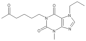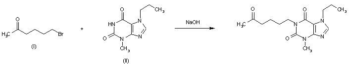 By condensation of 1-bromo-5-hexanone (I) with 3-methyl-7-propylxanthine (II) by means of NaOH in refluxing methanol - water.