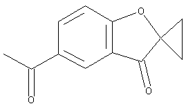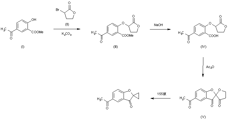 The reaction of methyl-5-acetylsalicylate (I) with alpha-bromo-gamma-butyrolactone (II) by means of K2CO3 in refluxing acetone gives alpha-[(2-methoxycarbonyl-4-acetylphenyl)oxy]-gamma-butyrolactone (III), which is hydrolyzed with NaOH in methanol yielding alpha-[(2-carboxy-4-acetylphenyl)oxy]-gamma-butyrolactone (IV). The cyclization of (IV) with refluxing acetic anhydride affords 5-acetyl-4',5'-dihydrospiro[benzofuran-2(3H),3'(2'H)-furan]-2',3-dione (V), which is finally treated at 155 C in dimethylsulfoxide containing NaCl.
