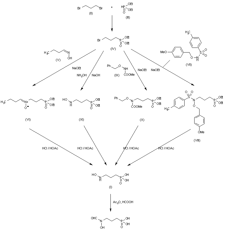 1) The condensation of 1,3-dibromopropane (II) with diethyl phosphonate (III) gives diethyl 3-bromopropylphosphonate (IV), which by reaction with butyraldehyde oxime (V) by means of sodium ethoxide in ethanol is converted to diethyl 3-(butylideneamino)propylphosphonate-N-oxide (VI). Finally, this compound is hydrolyzed with HCl in refluxing acetic acid to obtain compound (I). 2) The condensation of (IV) with N-(p-methoxybenzyloxy)-p-toluenesulfonamide (VII) by means of sodium ethoxide in ethanol gives diethyl 3-[N-methoxybenzyloxy)-N-tosylamino]propyl phosphonate (VIII), which is hydrolyzed with HCl in acetic acid to obtain compound (I). 3) The condensation of (IV) with methyl N-(benzyloxy)carbamate (IX) by means of sodium ethoxide in ethanol yields diethyl 3-(N-benzyloxy-N-methoxycarbonylamino)propylphosphonate (X), which is hydrolyzed with HCl in acetic acid to obtain compound (I). 4) The condensation of (IV) with hydroxylamine by means of NaOH in MeOH-H2O gives diethyl 3-(N-hydroxylamino)propylphosphonate (XI), which is hydrolyzed with HCl in acetic acid to obtain compound (I).