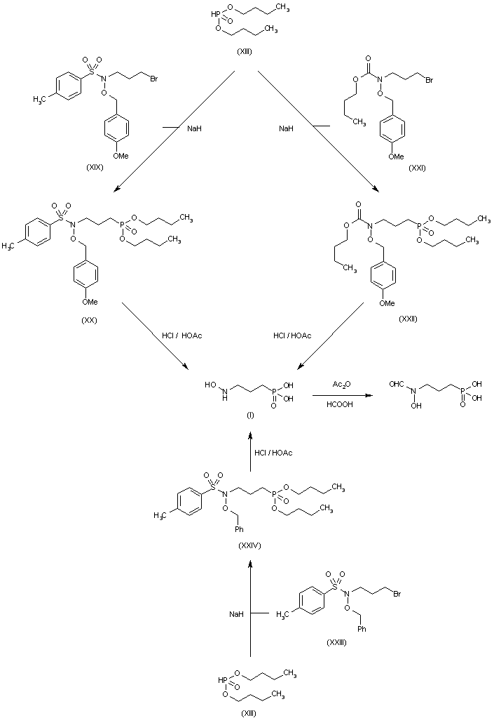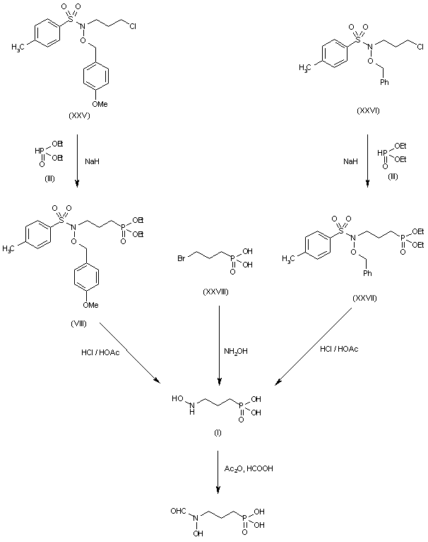 10) The condensation of diethyl phosphonate (III) with N-(p-methoxybenzyloxy)-N-(3-chloropropyl)-p-toluenesulfonamide (XXV) by means of NaH in refluxing benzene gives (VIII), which is hydrolyzed with HCl in acetic acid to obtain compound (I). 11) The condensation of (III) with N-(3-chloropropyl)-N-(benzyloxy)-p-toluenesulfonamide (XXVI) by means of NaH in refluxing benzene gives diethyl 3-(N-benzyloxy-N-tosylamino)propylphosphonate (XXVII), which is hydrolyzed with HCl in acetic acid to obtain compound (I). 12) By reaction of 3-bromopropylphosphonic acid (XXVIII) with hydroxylamine by means of sodium methoxide in MeOH to obtain compound (I).