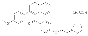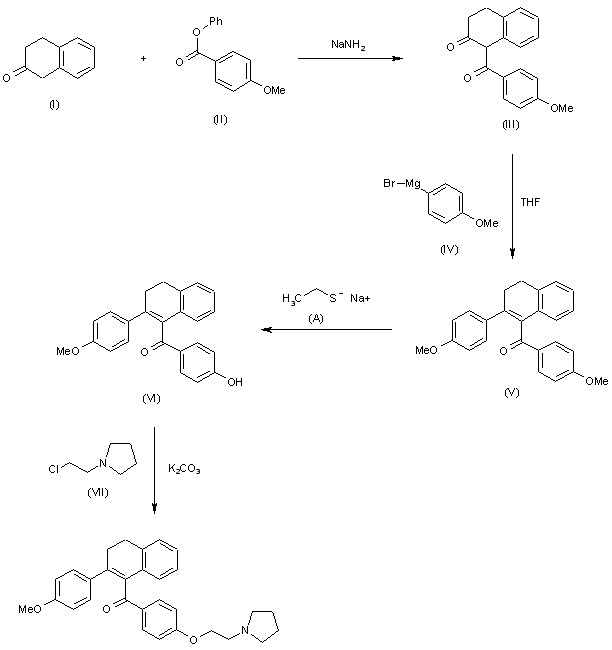 The condensation beta-tetralone (I) with phenyl 4-methoxybenzoate (II) by means of NaNH2 in THF gives 3,4-dihydro-1-(4-methoxybenzoyl)-2(1H)-naphthalenone (III), which is then submitted to a Grignard reaction with 4-methoxyphenylmagnesium bromide (IV) in hot THF yielding 3,4-dihydro-2-(4-methoxyphenyl)-1-naphthyl-4-methoxyphenyl ketone (V). The cleavage of one methoxy group of (V) with sodium ethylmercaptide (A) in dry DMF affords 3,4-dihydro-2-(4-methoxyphenyl)-1-naphthyl-4-hydroxyphenyl ketone (VI), which is finally condensed with N-(2-chloroethyl)pyrrolidine (VII) by means of K2CO3 in refluxing 2-butanone.