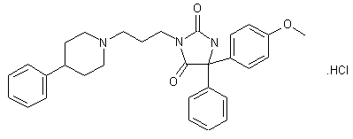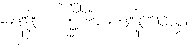 By condensation of 5-(4-methoxyphenyl)-5-phenylhydantoin (I) with 1-(3-chloropropyl)-4-phenylpiperidine (II) by means of sodium ethoxide in refluxing ethanol followed by a treatment with HCl.