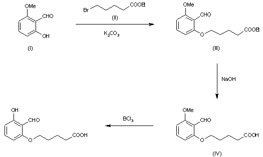 The reaction of 2-hydroxy-6-methoxybenzaldehyde (I) with ethyl 5-bromopentanoate (II) by means of K2CO3 and NaI in refluxing ethanol gives ethyl 5-(2-formyl-3-methoxyphenoxy)pentanoate (III), which is hydrolyzed with NaOH in ethanol - water yielding 5-(2-formyl-3-methoxyphenoxy)pentanoic acid (IV). Finally, this compound is demethylated by treatment with BCl3 in CH2Cl2.