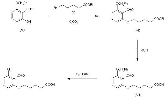 The reaction of 2-hydroxy-6-benzyloxybenzaldehyde (V) with ethyl 5-bromopentanoate (II) by means of K2CO3 and NaI in refluxing ethanol gives ethyl 5-(2-formyl-3-benzyloxyphenoxy)pentanoate (VI), which is hydrolyzed with KOH in ethanol yielding 5-(2-formyl-3-benzyloxyphenoxy)pentanoic acid (VII) Finally, this compound is debenzylated by hydrogenation with H2 over Pd/c in ethanol.