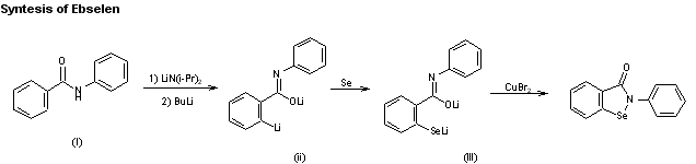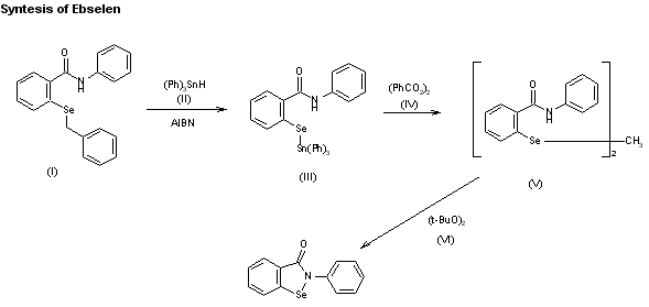A new synthesis of ebselen has been published: The radical reaction of 2-(benzylseleno)-N-phenylbenzamide (I) with triphenyltin hydride (II) and AIBN in refluxing benzene gives N-phenyl-2-(triphenylstannylseleno)benzamide (III), which is treated with dibenzoyl peroxide (IV) in refluxing benzene to yield the diselenide (V). Finally, the diselenide (V) was treated with di-tert-butyl peroxide (VI) in chlorobenzene at 120 C. This reaction cannot be carried out in refluxing benzene due to the extreme insolubility of (V) in benzene.