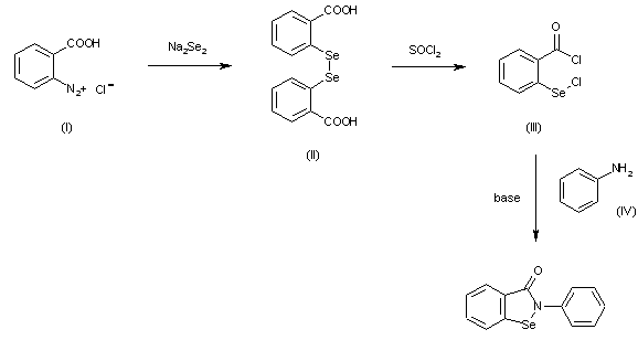The neutralized diazonium salt of anthranilic acid (I) is treated with sodium diselenide yielding diselenosalicylic acid (II), which is treated with thionyl chloride to give the selenenyl chloride (III). Treatment of (III) with aniline (IV) in the presence of a base affords PZ-51.